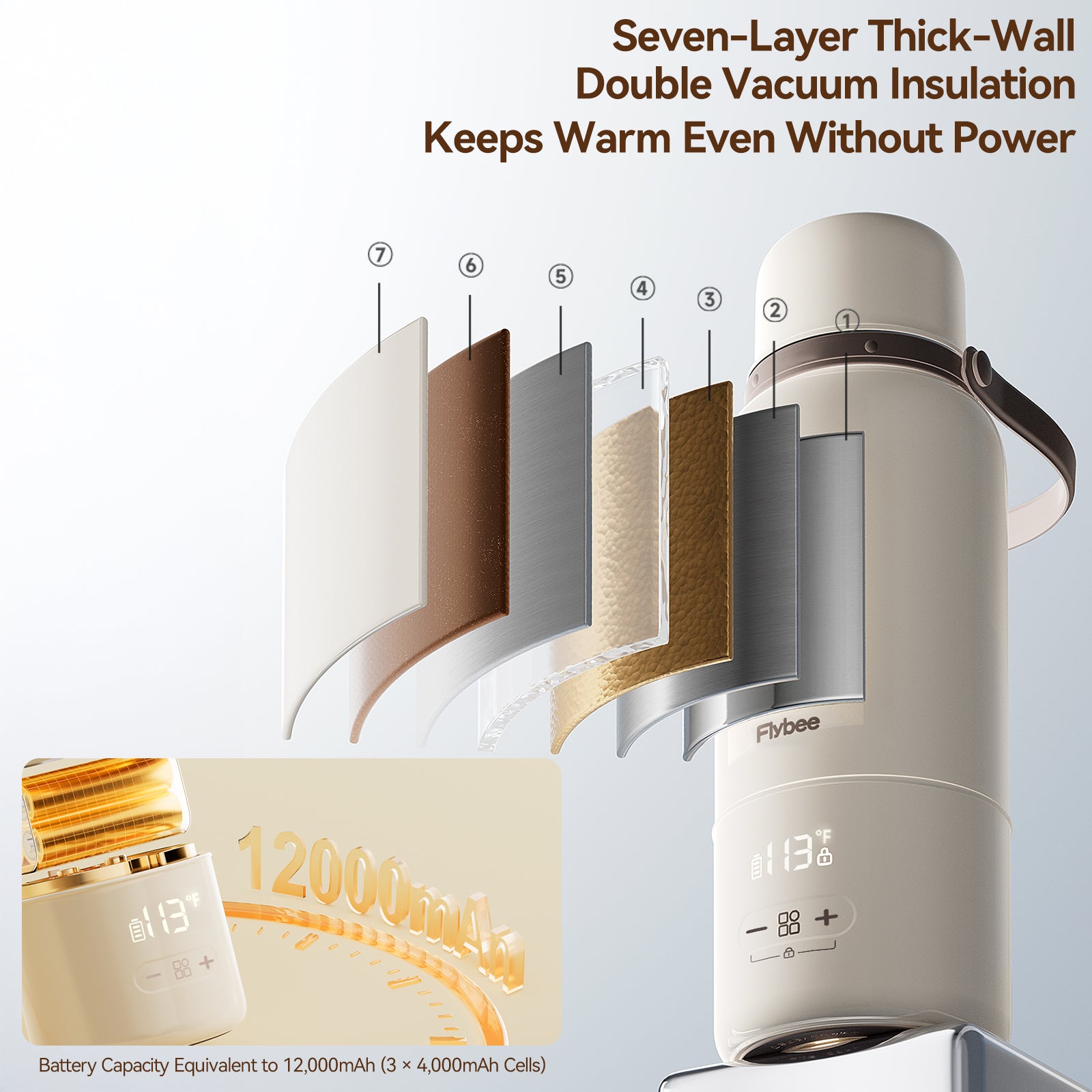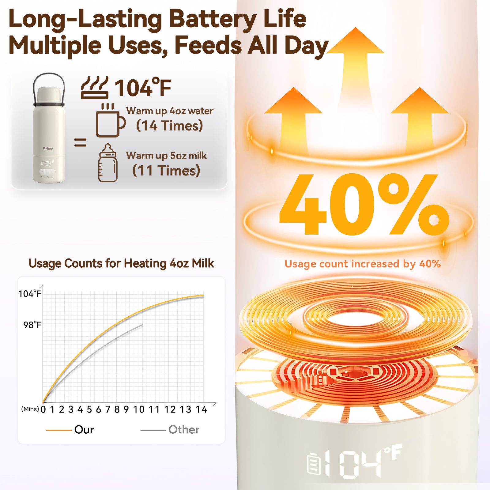 - Long-Lasting Battery: This bottle warmer on the go features a powerful 12,000mAh battery that charges to 80% in just one hour, heats up 5 oz of milk 11 times on a full charge, and maintains warmth for up to 35 hours when fully charged, making it a reliable choice for on-the-go parents (Note: The DC 11.1V/4000mAh in the user manual refers to three 3.7V 4000mAh cells, which is 12000mAh)