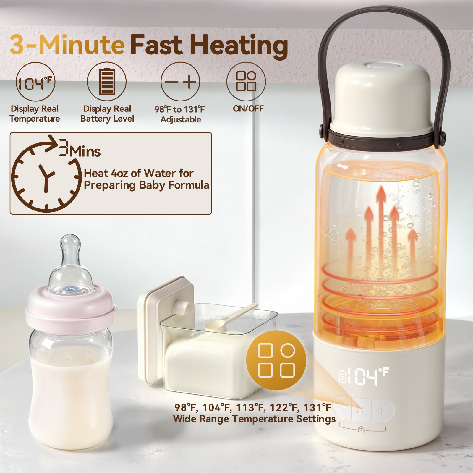- Dual Temperature Model Setting: This travel bottle warmer can be precisely adjusted from 98°F to 131°F within ±1°F, supporting five wide range specific temperature settings: 98°F, 104°F, 113°F, 122°F, and 131°F. It can warm milk or water for formula and also heat coffee, tea, and hot chocolate for outdoor activities